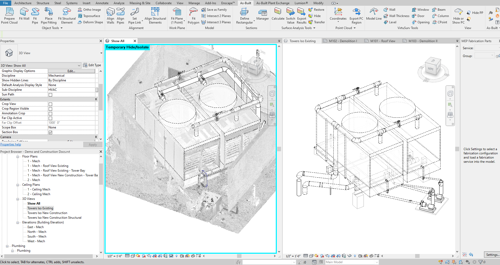 Using laser scanning and specific point cloud tools inside Revit, we are able to quickly build an accurate model of the field conditions of complex systems.